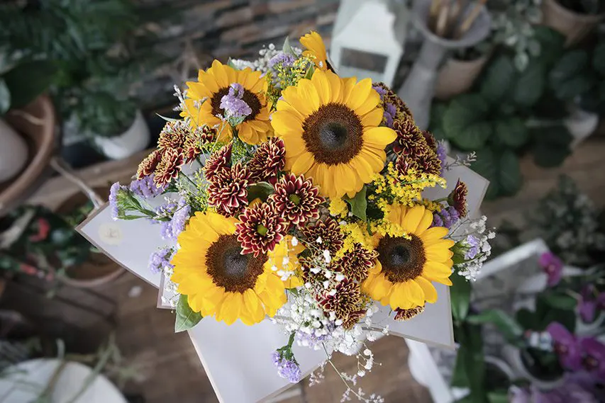 Ramo de Flores Luz de Mogán. Ramo luminoso y alegre, perfecto para regalar calidez y buen ánimo. Con papel coreano.