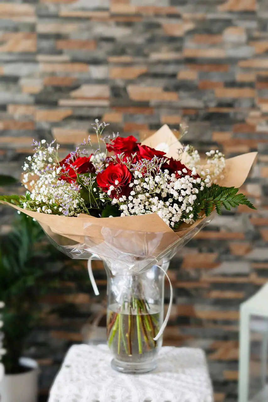 Ramo de Rosas Redondo 8 rosas. Papel coreanom limonium y lluvia blanca.